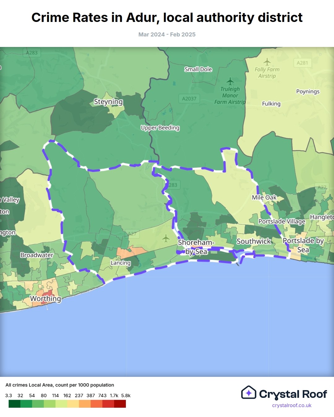 Annual total crime rate in Adur, (local authority district) is 69.8 crimes per thousand resident population. This can be rated as 2 out of 10 or low crime level compared to other boroughs/local authority districts in England and Wales.