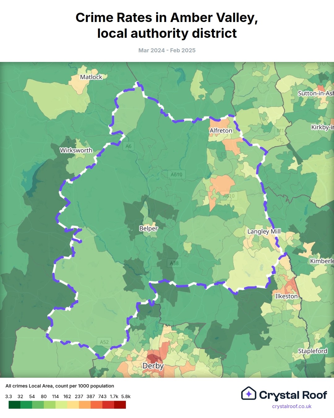 The figures in black represent the number of crimes of a certain type per thousand resident population in Amber Valley (local authority district).