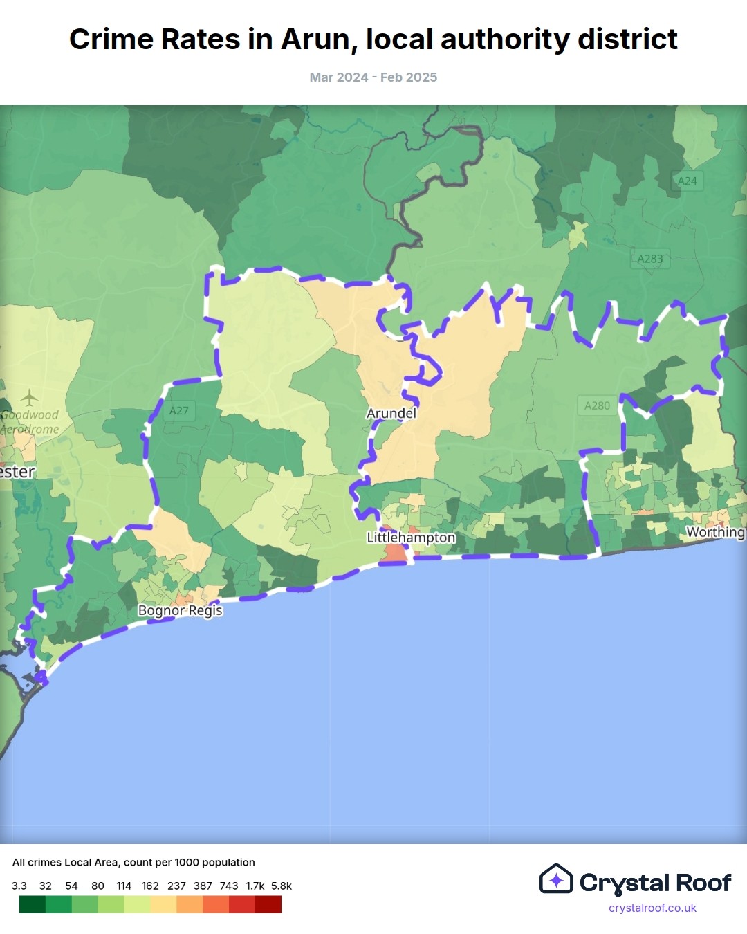 Annual total crime rate in Arun, (local authority district) is 83 crimes per thousand resident population. This can be rated as 3 out of 10 or low crime level compared to other boroughs/local authority districts in England and Wales.