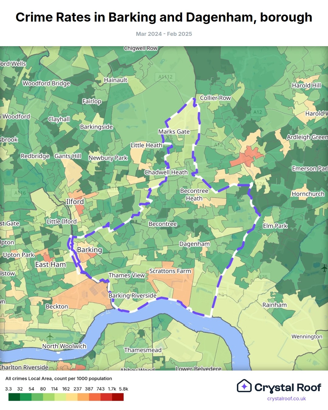 The figures in grey indicate the relative ratings of Barking and Dagenham (borough) for a specific crime type compared to other boroughs/local authority districts in England and Wales.