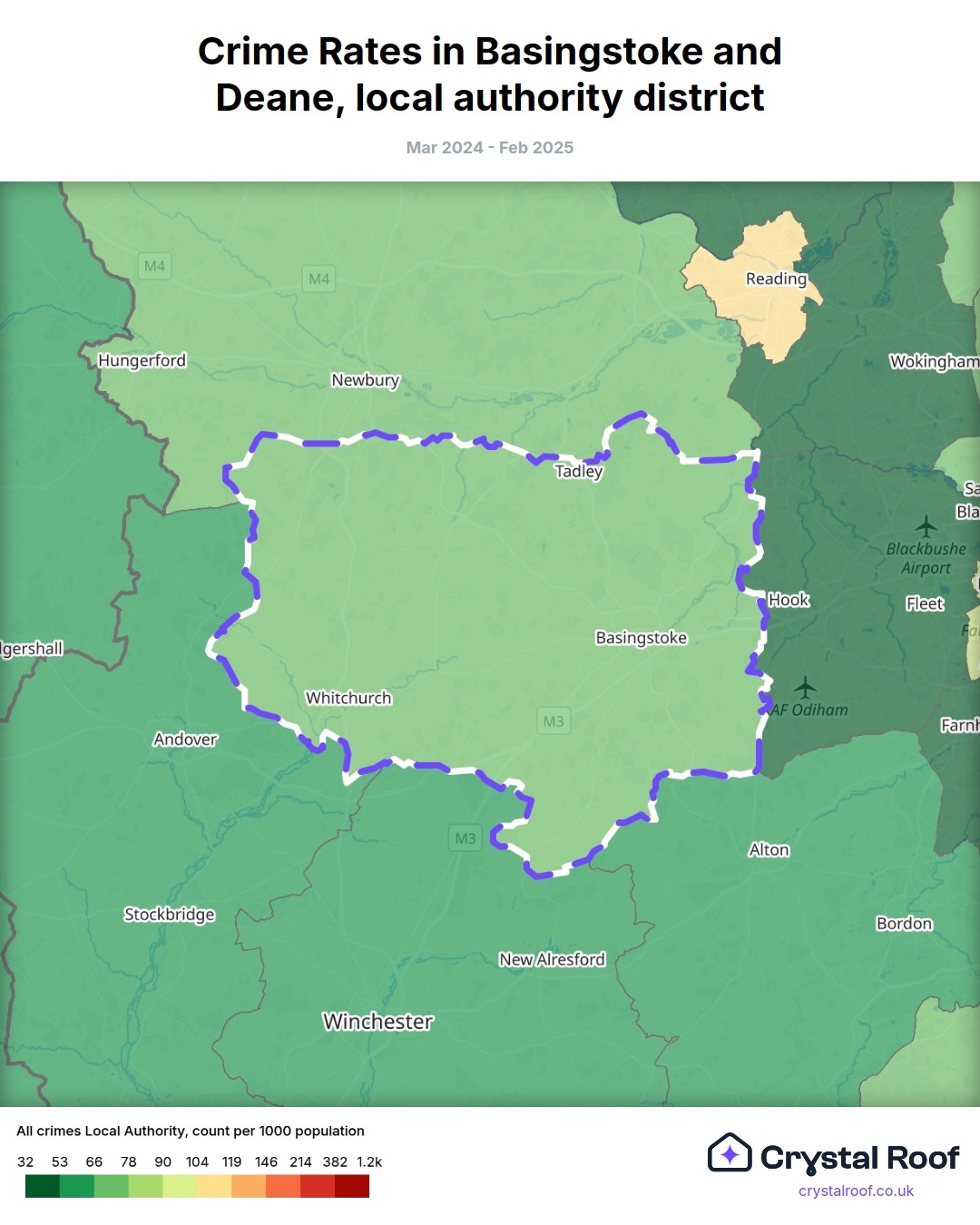 Annual total crime rate in Basingstoke and Deane, (local authority district) is 74.1 crimes per thousand resident population. This can be rated as 3 out of 10 or low crime level compared to other boroughs/local authority districts in England and Wales.