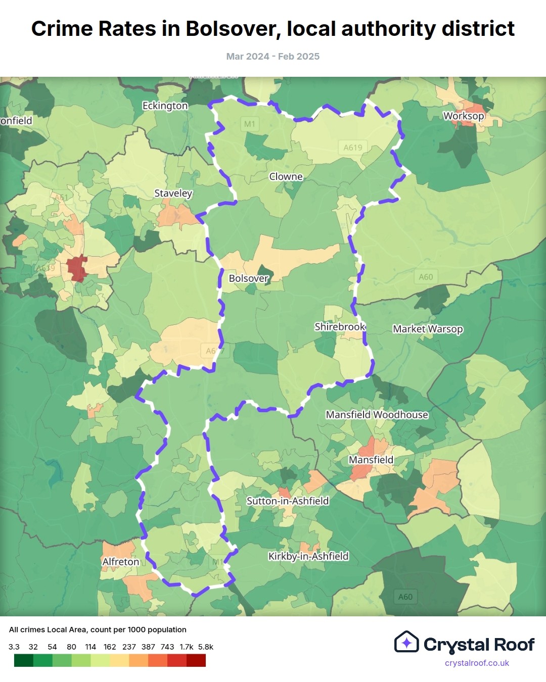 The figures in grey indicate the relative ratings of Bolsover (local authority district) for a specific crime type compared to other boroughs/local authority districts in England and Wales.