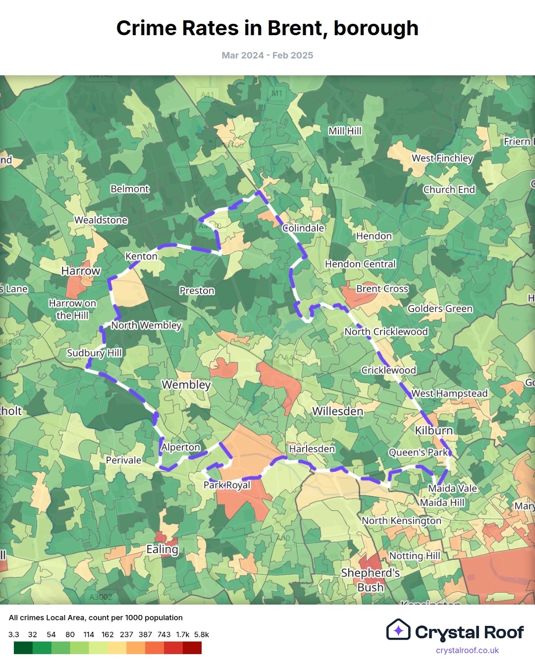 The figures in grey indicate the relative ratings of Brent (borough) for a specific crime type compared to other boroughs/local authority districts in England and Wales.