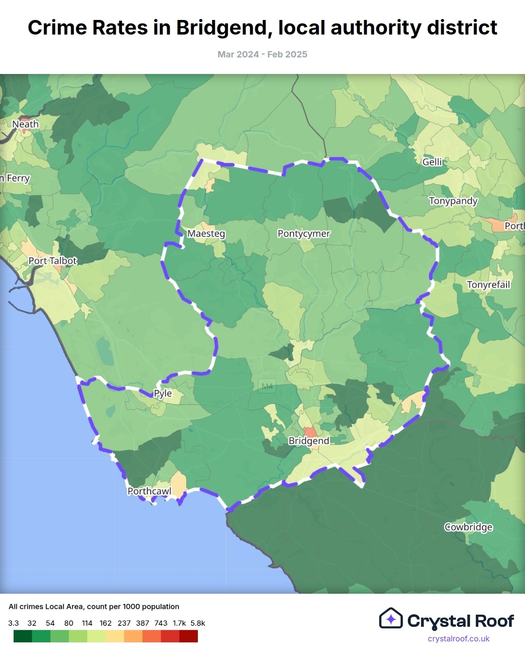 The figures in grey indicate the relative ratings of Bridgend (local authority district) for a specific crime type compared to other boroughs/local authority districts in England and Wales.