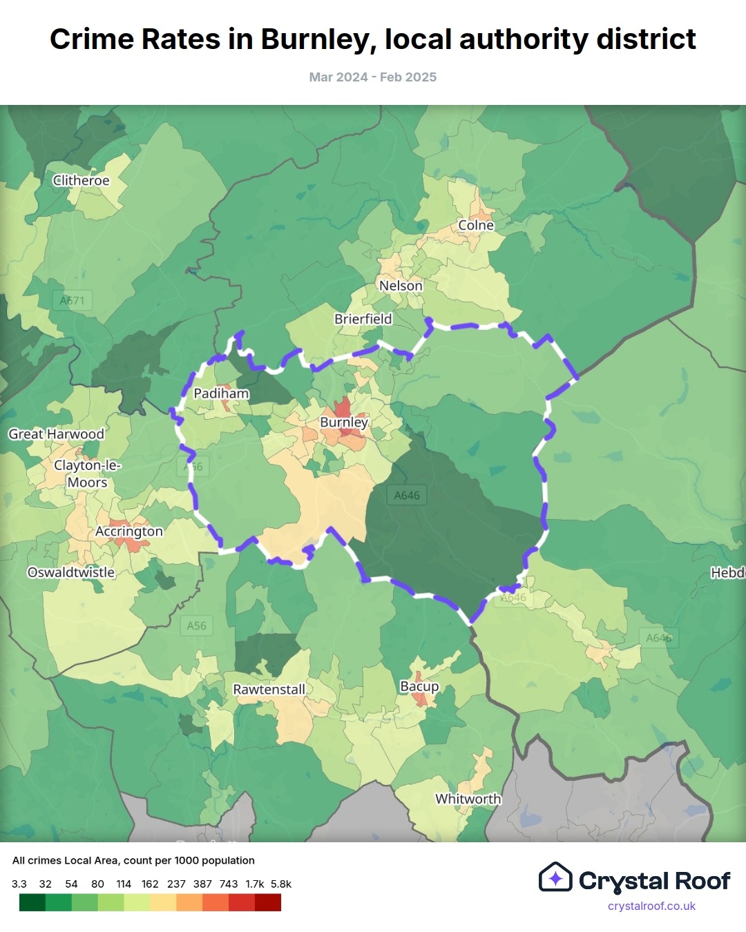 Annual total crime rate in Burnley, (local authority district) is 148 crimes per thousand resident population. This can be rated as 7 out of 10 or high crime level compared to other boroughs/local authority districts in England and Wales.