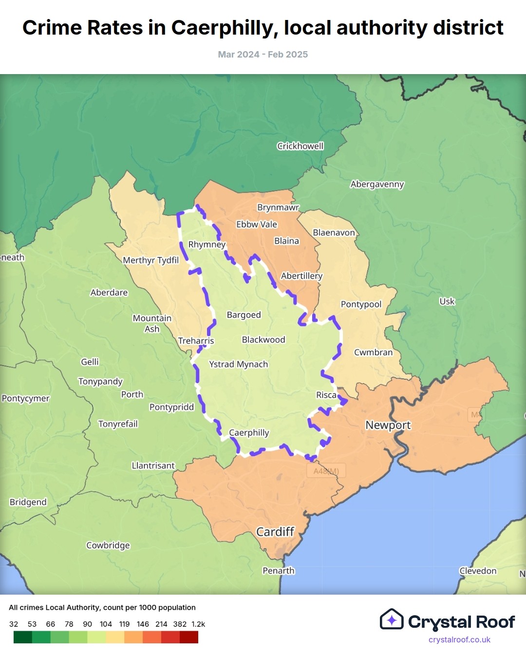 Annual total crime rate in Caerphilly, (local authority district) is 89.9 crimes per thousand resident population. This can be rated as 4 out of 10 or low crime level compared to other boroughs/local authority districts in England and Wales.