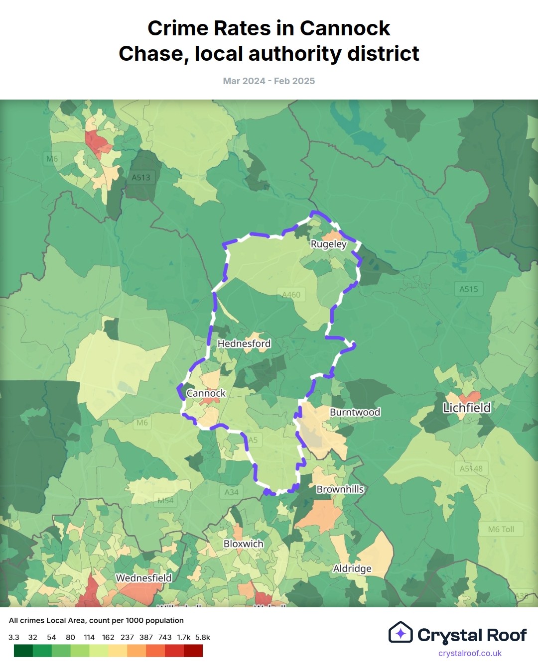 Annual total crime rate in Cannock Chase, (local authority district) is 86.2 crimes per thousand resident population. This can be rated as 4 out of 10 or low crime level compared to other boroughs/local authority districts in England and Wales.