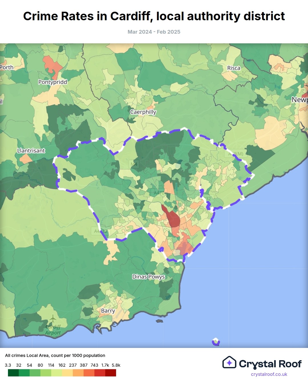 Annual total crime rate in Cardiff, (local authority district) is 117 crimes per thousand resident population. This can be rated as 6 out of 10 or medium crime level compared to other boroughs/local authority districts in England and Wales.