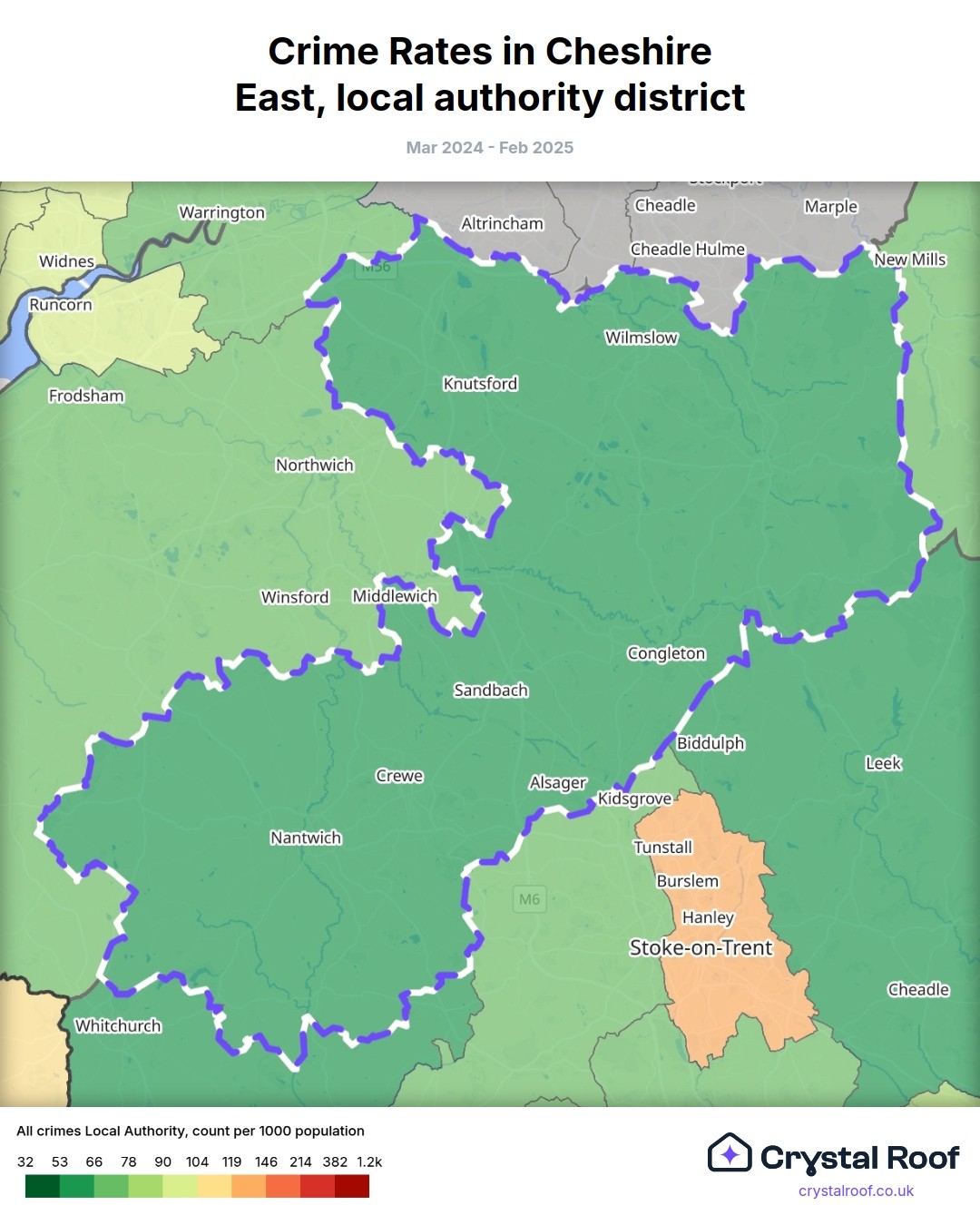 Annual total crime rate in Cheshire East, (local authority district) is 64.4 crimes per thousand resident population. This can be rated as 2 out of 10 or low crime level compared to other boroughs/local authority districts in England and Wales.