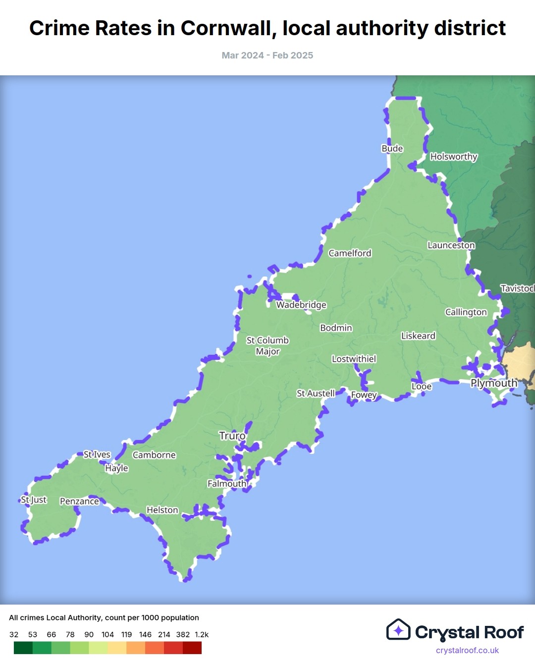 Annual total crime rate in Cornwall, (local authority district) is 74.4 crimes per thousand resident population. This can be rated as 3 out of 10 or low crime level compared to other boroughs/local authority districts in England and Wales.