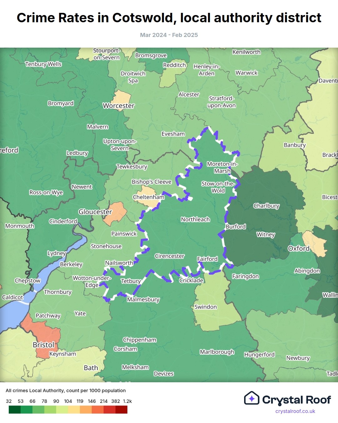 The figures in grey indicate the relative ratings of Cotswold (local authority district) for a specific crime type compared to other boroughs/local authority districts in England and Wales.