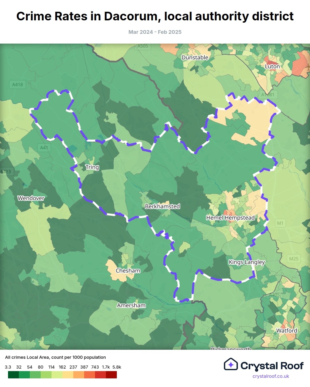 Annual total crime rate in Dacorum, (local authority district) is 94.2 crimes per thousand resident population. This can be rated as 4 out of 10 or low crime level compared to other boroughs/local authority districts in England and Wales.