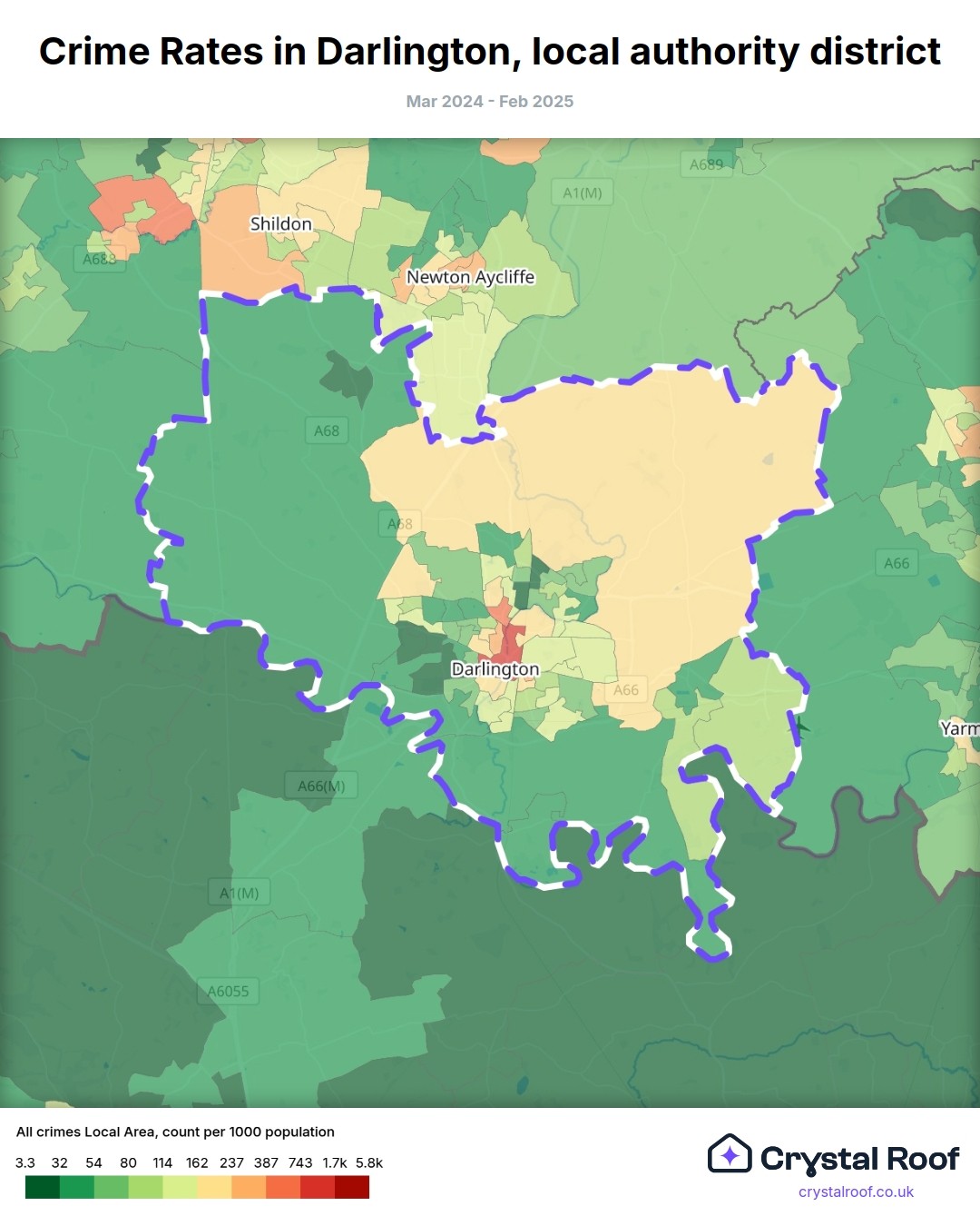 Annual total crime rate in Darlington, (local authority district) is 112 crimes per thousand resident population. This can be rated as 5 out of 10 or medium crime level compared to other boroughs/local authority districts in England and Wales.