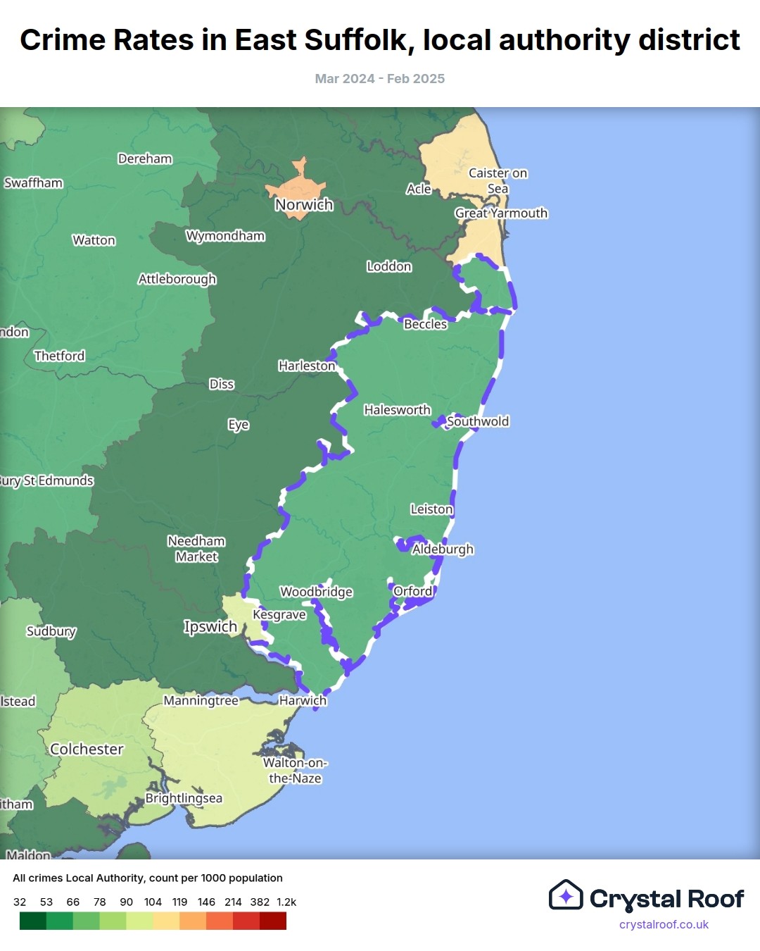 Annual total crime rate in East Suffolk, (local authority district) is 57 crimes per thousand resident population. This can be rated as 1 out of 10 or low crime level compared to other boroughs/local authority districts in England and Wales.