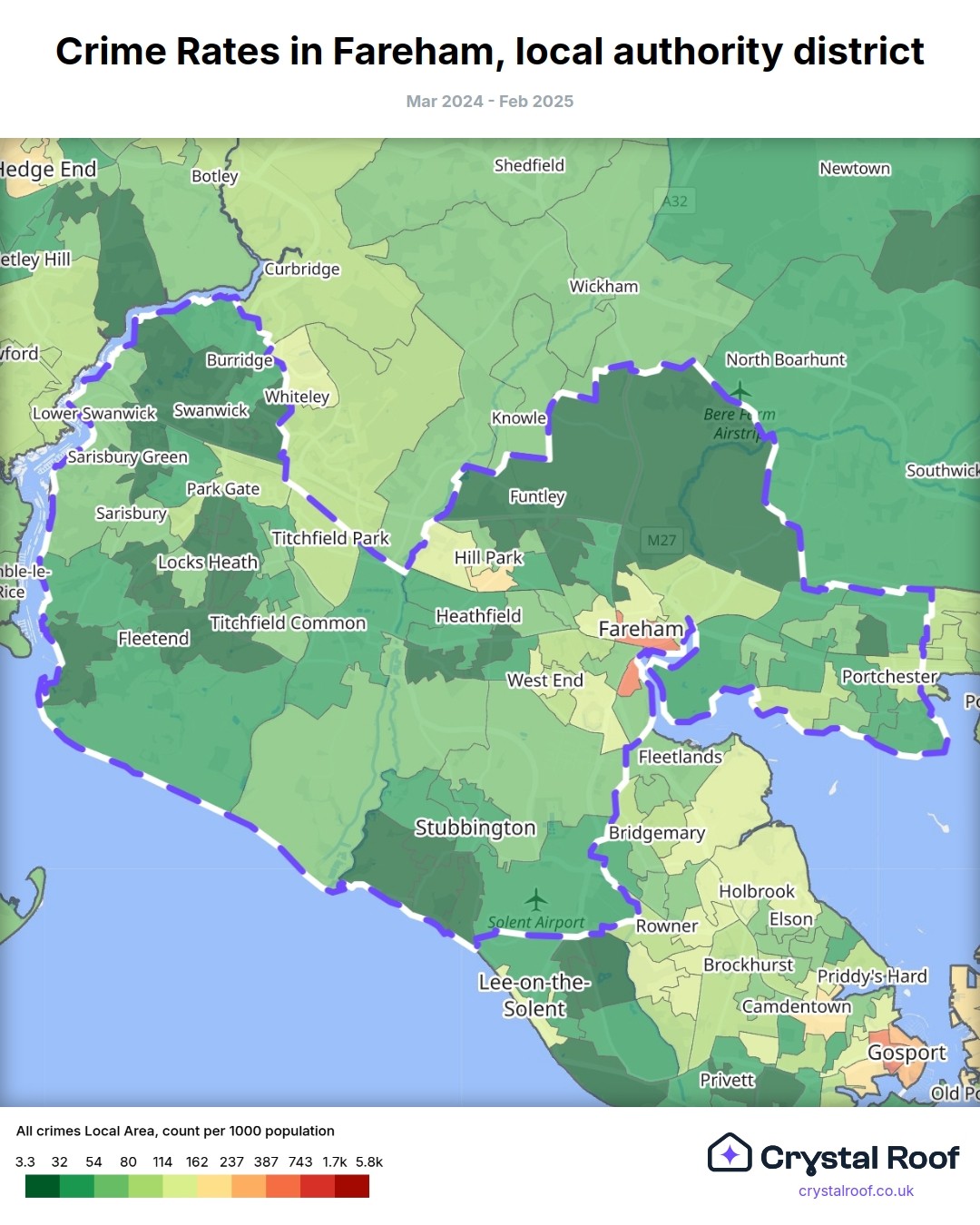 Annual total crime rate in Fareham, (local authority district) is 59.3 crimes per thousand resident population. This can be rated as 2 out of 10 or low crime level compared to other boroughs/local authority districts in England and Wales.