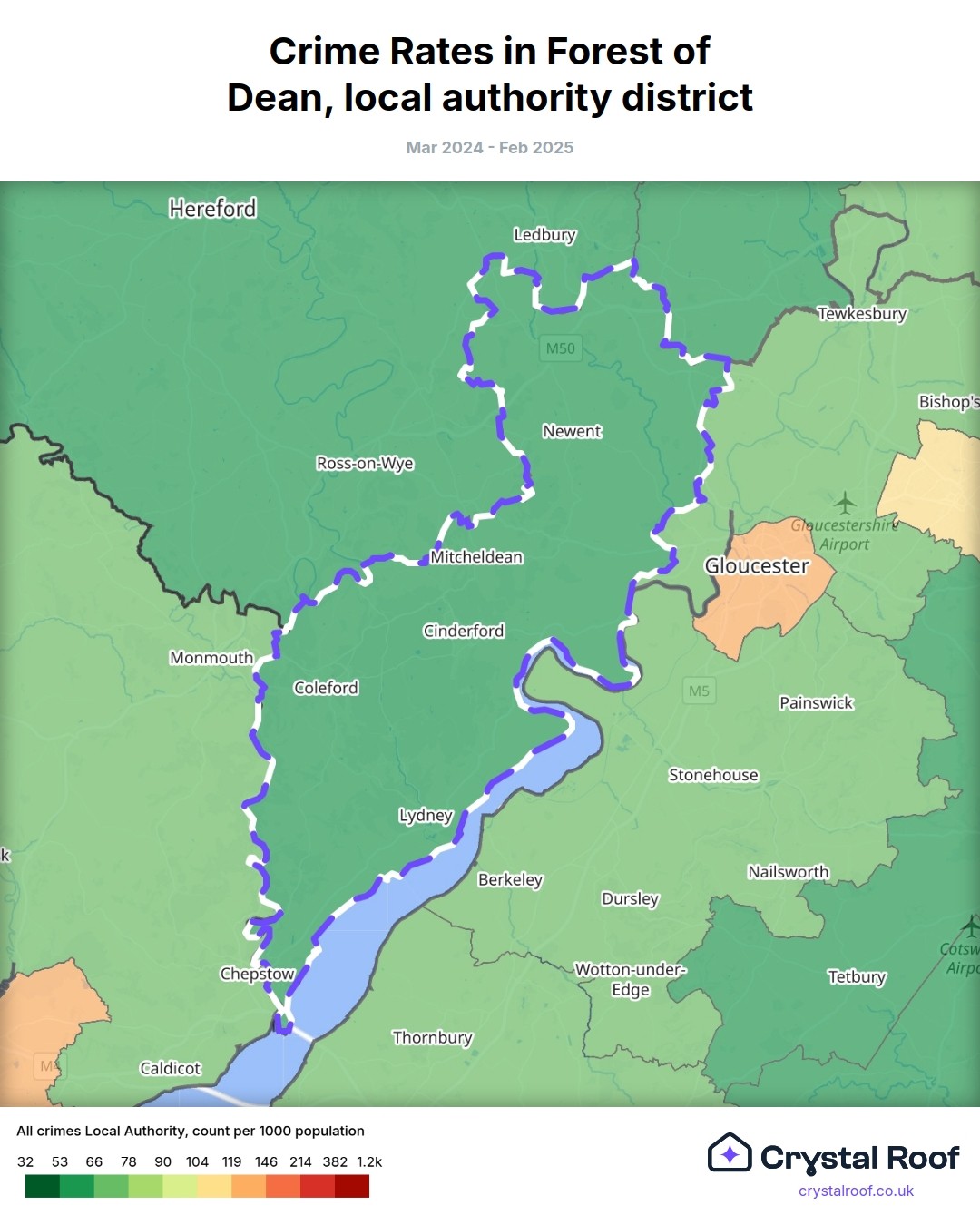 Annual total crime rate in Forest of Dean, (local authority district) is 67.2 crimes per thousand resident population. This can be rated as 2 out of 10 or low crime level compared to other boroughs/local authority districts in England and Wales.