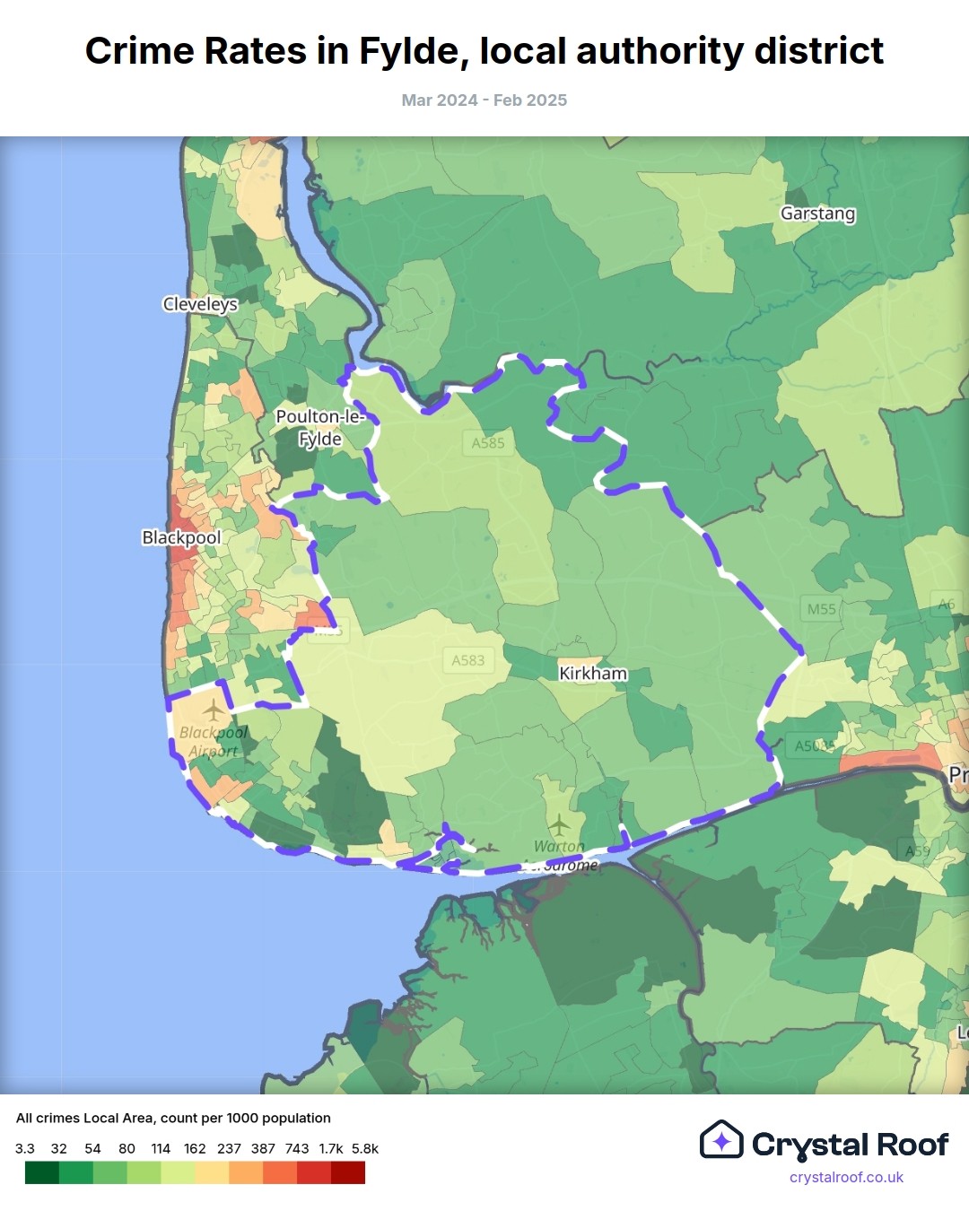 Annual total crime rate in Fylde, (local authority district) is 85.2 crimes per thousand resident population. This can be rated as 3 out of 10 or low crime level compared to other boroughs/local authority districts in England and Wales.