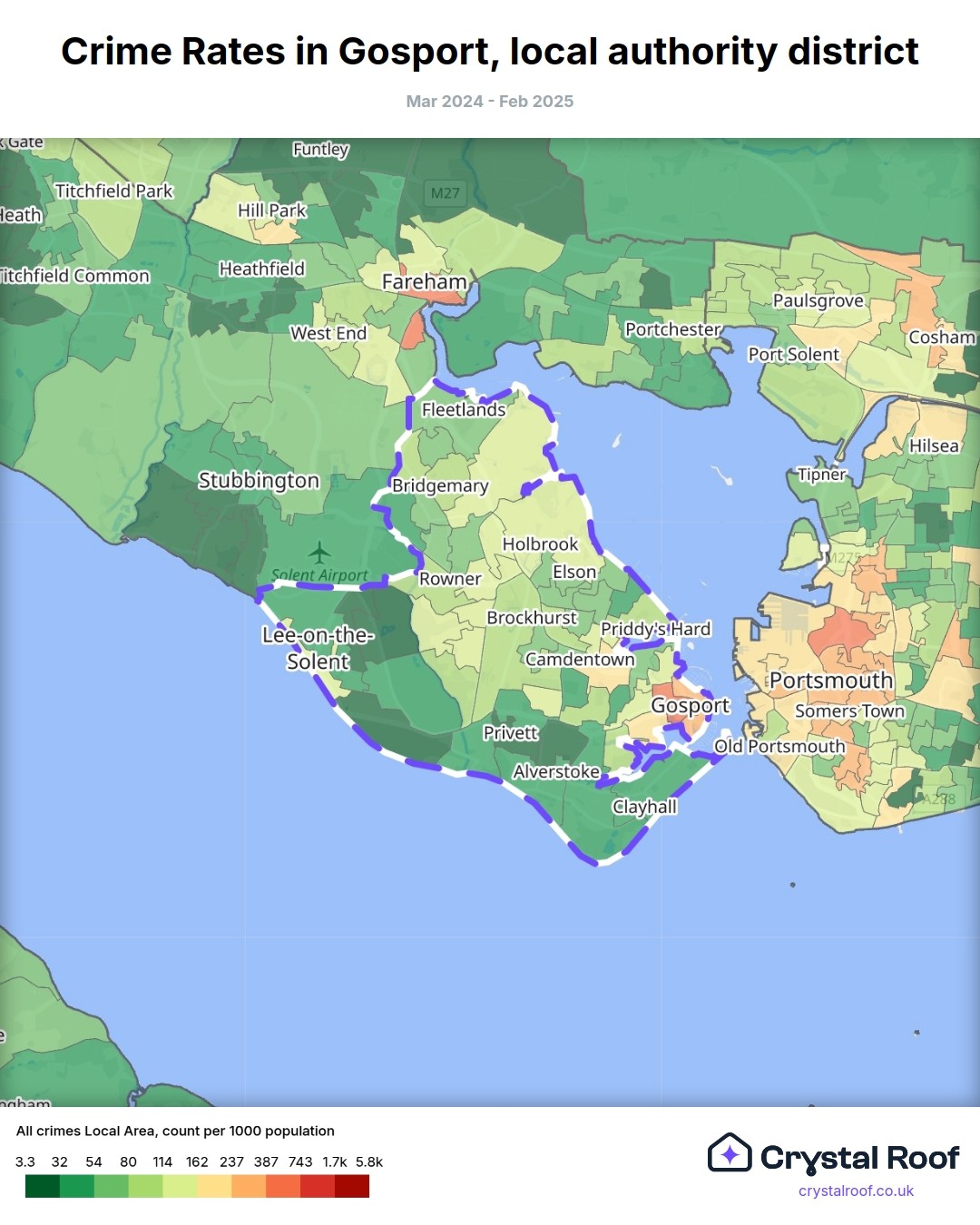 The figures in grey indicate the relative ratings of Gosport (local authority district) for a specific crime type compared to other boroughs/local authority districts in England and Wales.