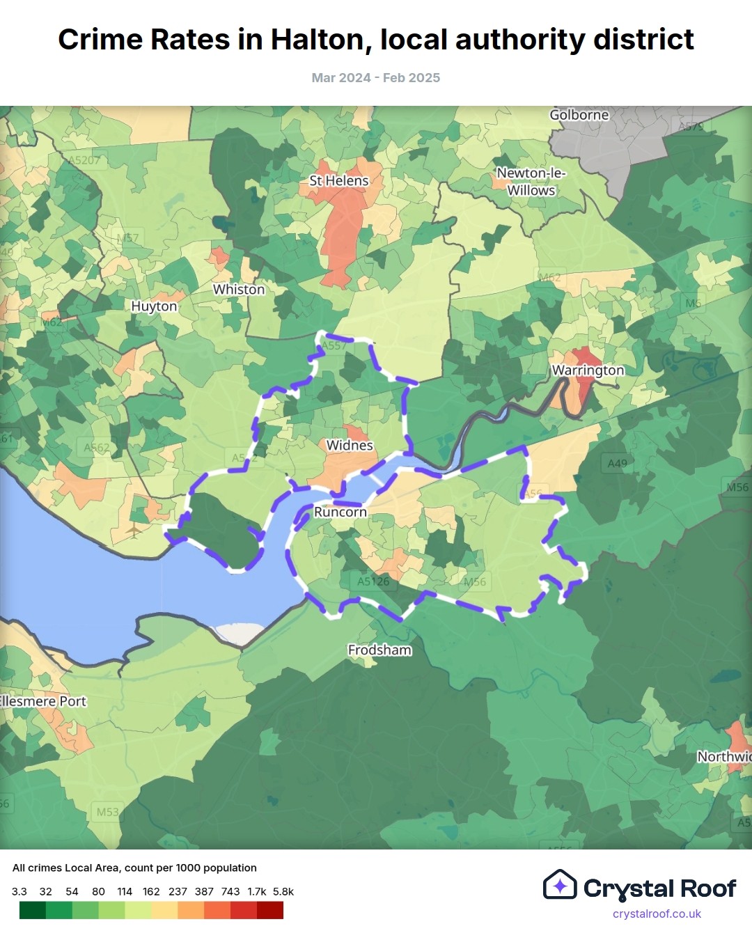 Annual total crime rate in Halton, (local authority district) is 91.4 crimes per thousand resident population. This can be rated as 4 out of 10 or low crime level compared to other boroughs/local authority districts in England and Wales.