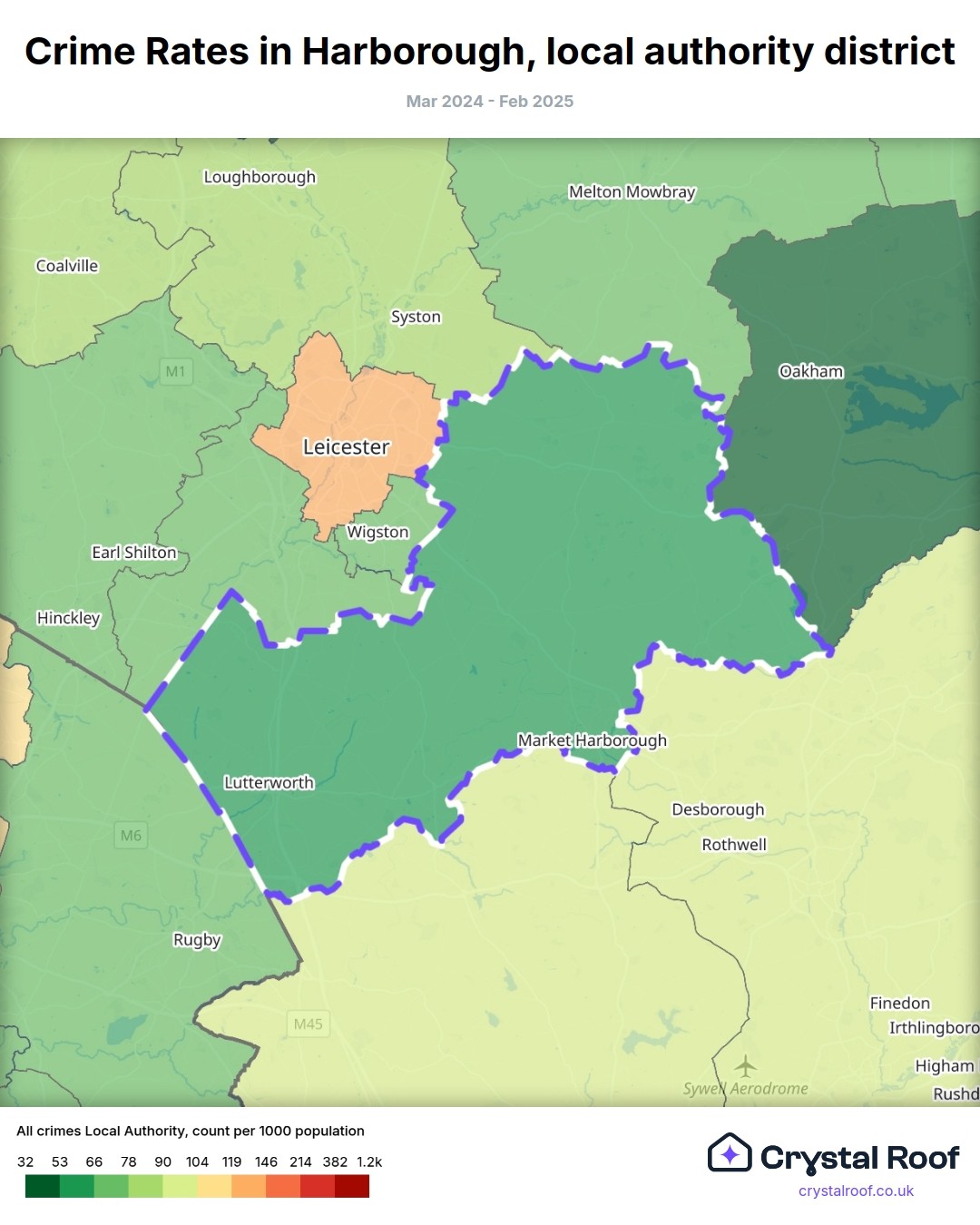 Annual total crime rate in Harborough, (local authority district) is 54.7 crimes per thousand resident population. This can be rated as 1 out of 10 or low crime level compared to other boroughs/local authority districts in England and Wales.