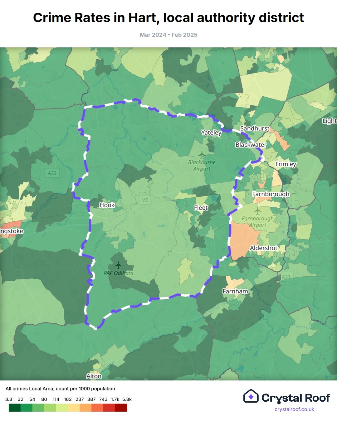 Annual total crime rate in Hart, (local authority district) is 47.9 crimes per thousand resident population. This can be rated as 1 out of 10 or low crime level compared to other boroughs/local authority districts in England and Wales.