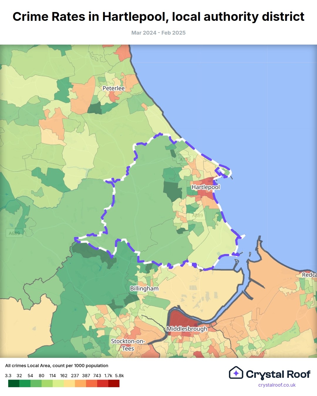 Annual total crime rate in Hartlepool, (local authority district) is 171 crimes per thousand resident population. This can be rated as 8 out of 10 or high crime level compared to other boroughs/local authority districts in England and Wales.