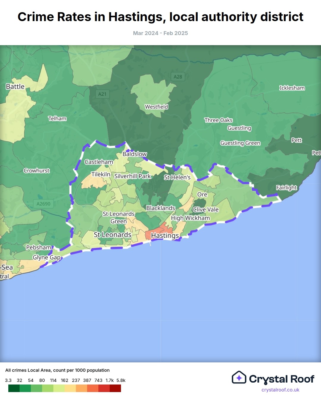 Annual total crime rate in Hastings, (local authority district) is 115 crimes per thousand resident population. This can be rated as 6 out of 10 or medium crime level compared to other boroughs/local authority districts in England and Wales.