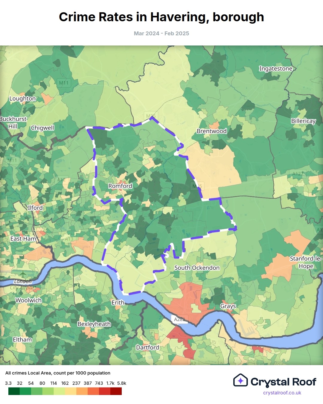 The figures in grey indicate the relative ratings of Havering (borough) for a specific crime type compared to other boroughs/local authority districts in England and Wales.
