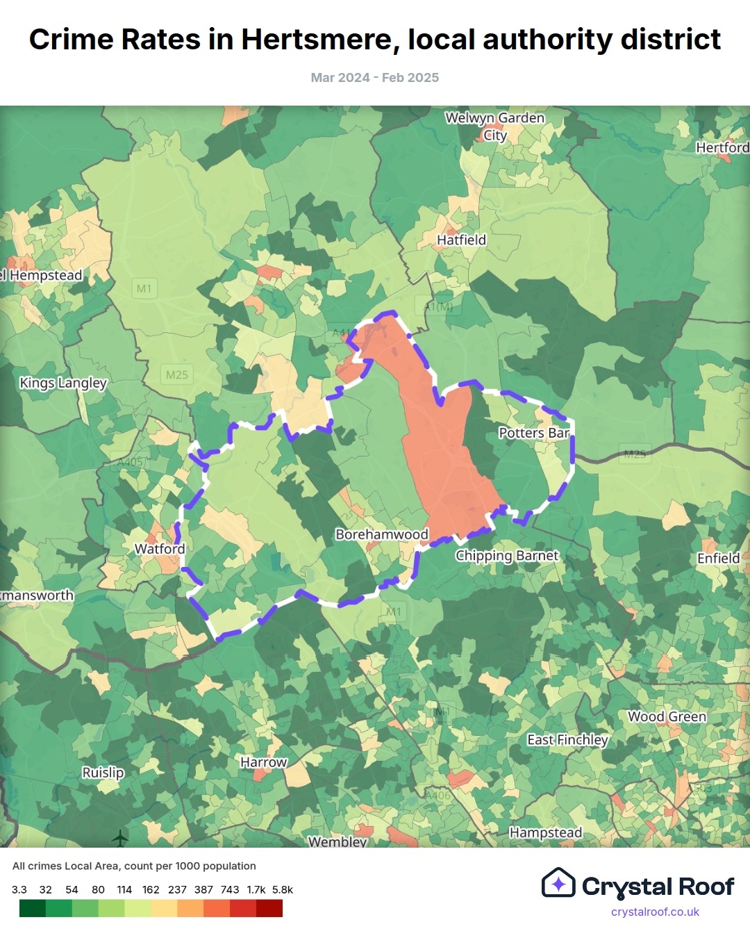 The figures in grey indicate the relative ratings of Hertsmere (local authority district) for a specific crime type compared to other boroughs/local authority districts in England and Wales.