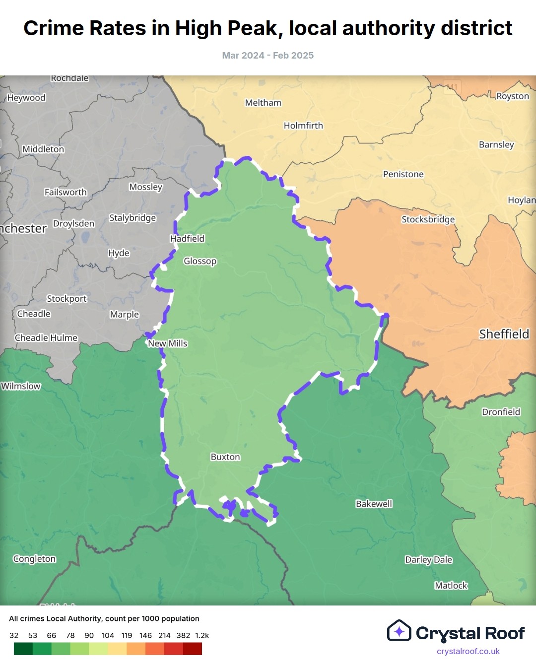Annual total crime rate in High Peak, (local authority district) is 73.9 crimes per thousand resident population. This can be rated as 3 out of 10 or low crime level compared to other boroughs/local authority districts in England and Wales.