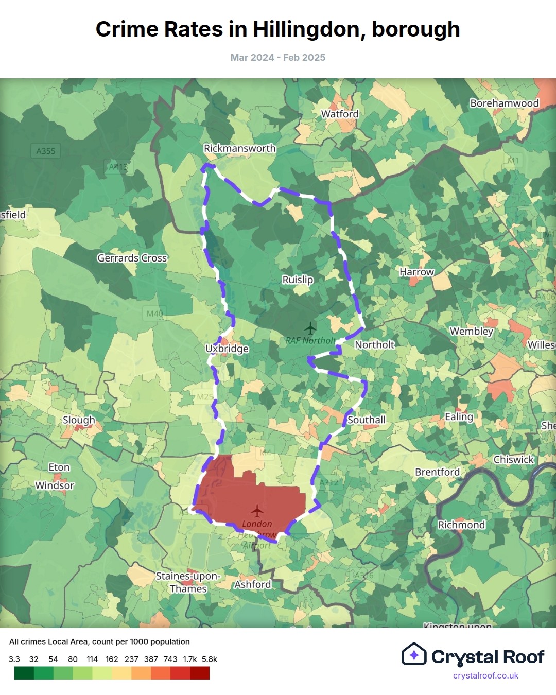 The figures in grey indicate the relative ratings of Hillingdon (borough) for a specific crime type compared to other boroughs/local authority districts in England and Wales.