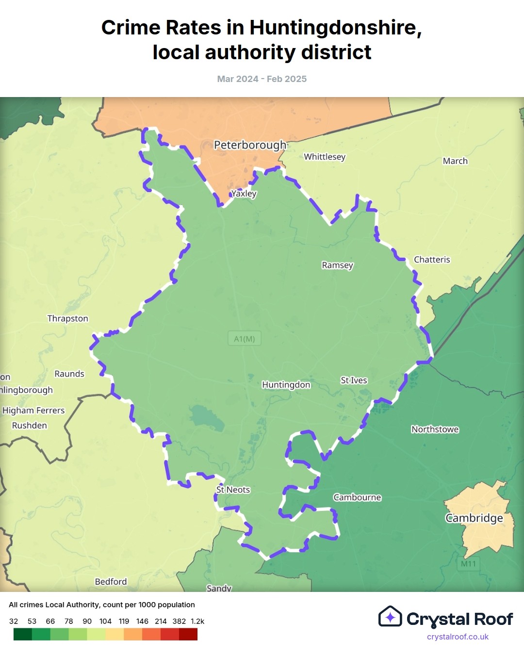 Annual total crime rate in Huntingdonshire, (local authority district) is 73.6 crimes per thousand resident population. This can be rated as 3 out of 10 or low crime level compared to other boroughs/local authority districts in England and Wales.