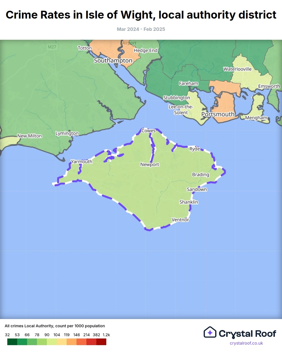 Annual total crime rate in Isle of Wight, (local authority district) is 84.9 crimes per thousand resident population. This can be rated as 3 out of 10 or low crime level compared to other boroughs/local authority districts in England and Wales.