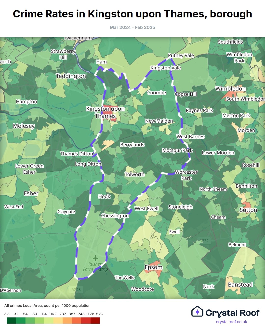 The figures in grey indicate the relative ratings of Kingston upon Thames (borough) for a specific crime type compared to other boroughs/local authority districts in England and Wales.