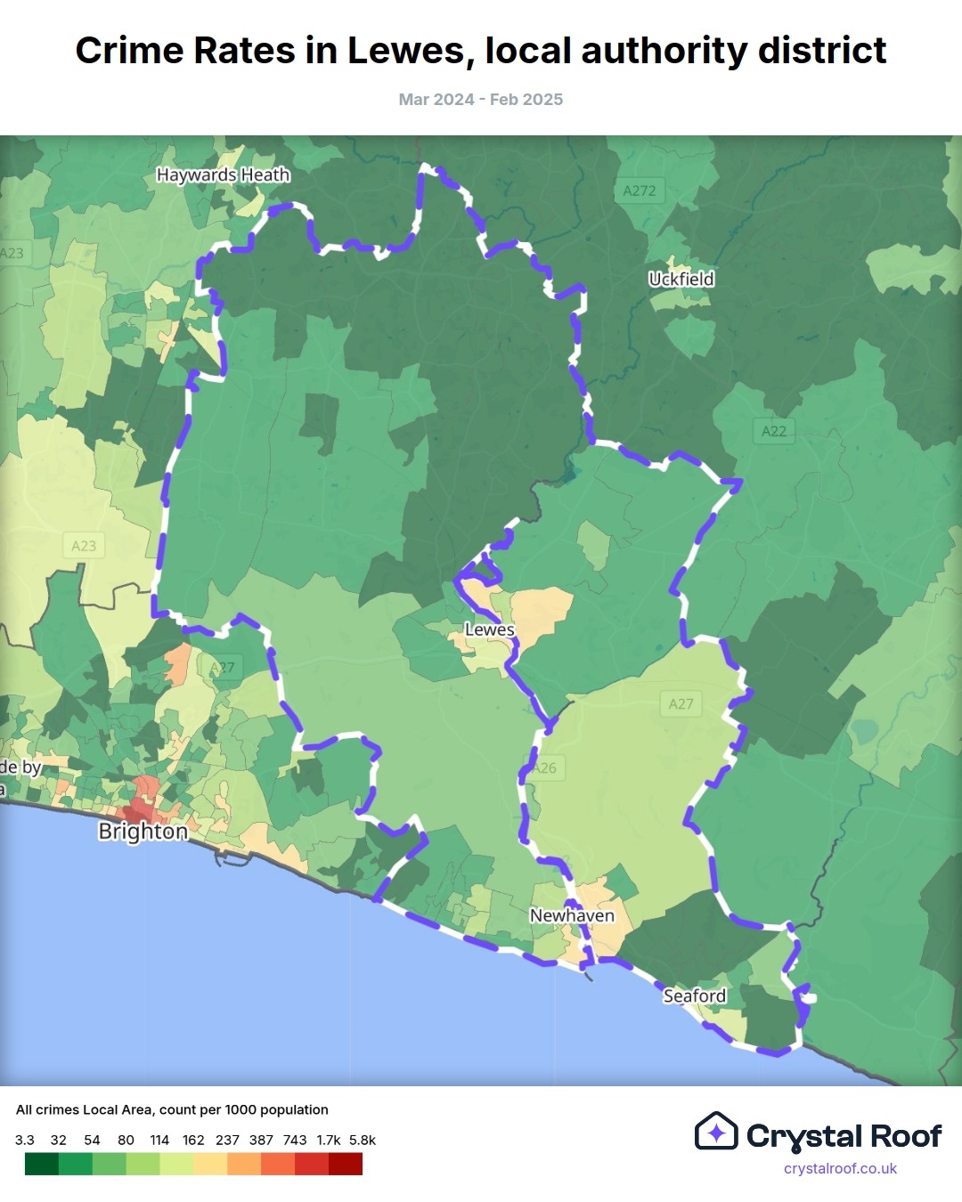 Above are annual crime rates in Lewes (local authority district) by crime type.