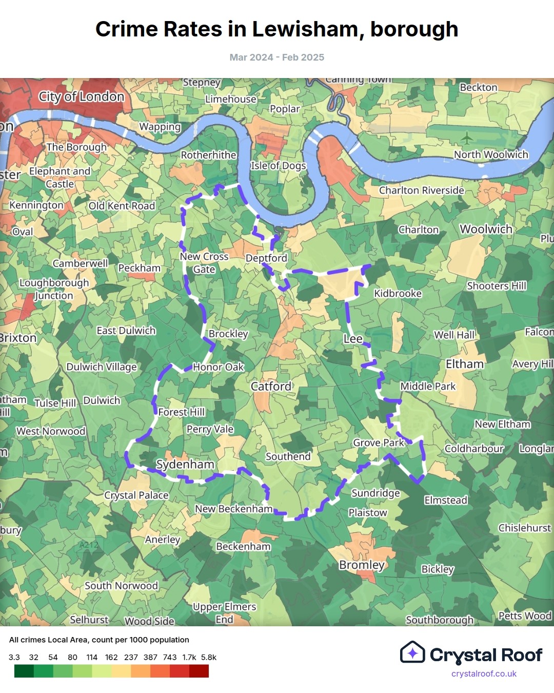 The figures in grey indicate the relative ratings of Lewisham (borough) for a specific crime type compared to other boroughs/local authority districts in England and Wales.