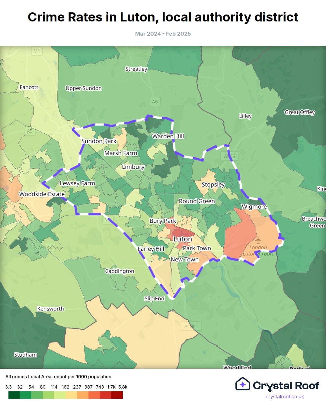 Annual total crime rate in Luton, (local authority district) is 101 crimes per thousand resident population. This can be rated as 4 out of 10 or low crime level compared to other boroughs/local authority districts in England and Wales.