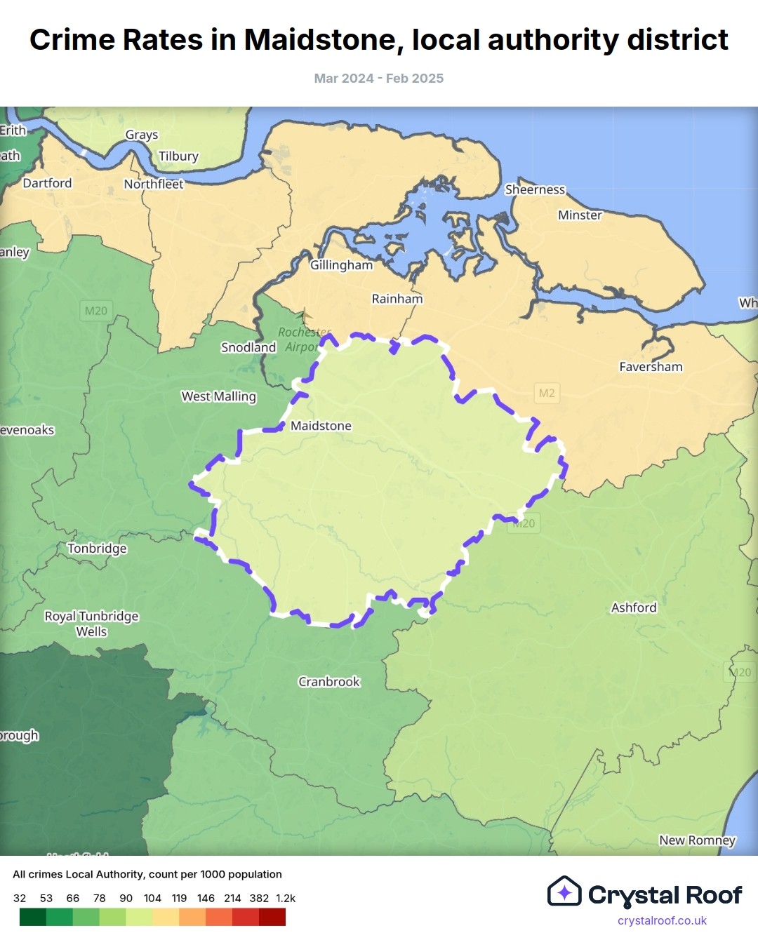 Annual total crime rate in Maidstone, (local authority district) is 94.7 crimes per thousand resident population. This can be rated as 4 out of 10 or low crime level compared to other boroughs/local authority districts in England and Wales.