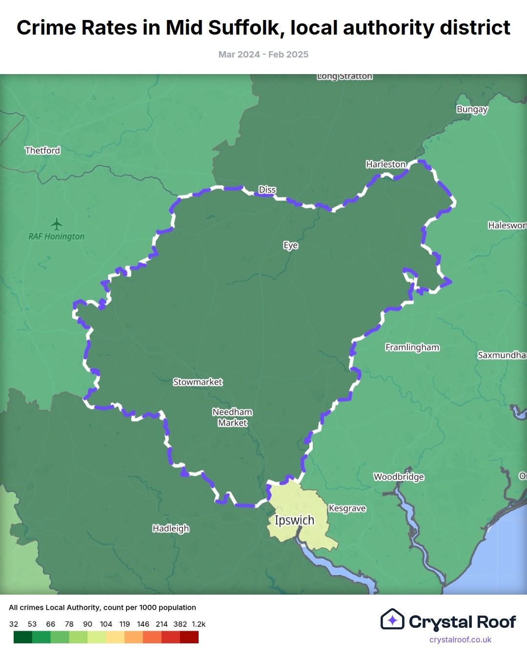 Annual total crime rate in Mid Suffolk, (local authority district) is 42.4 crimes per thousand resident population. This can be rated as 1 out of 10 or low crime level compared to other boroughs/local authority districts in England and Wales.