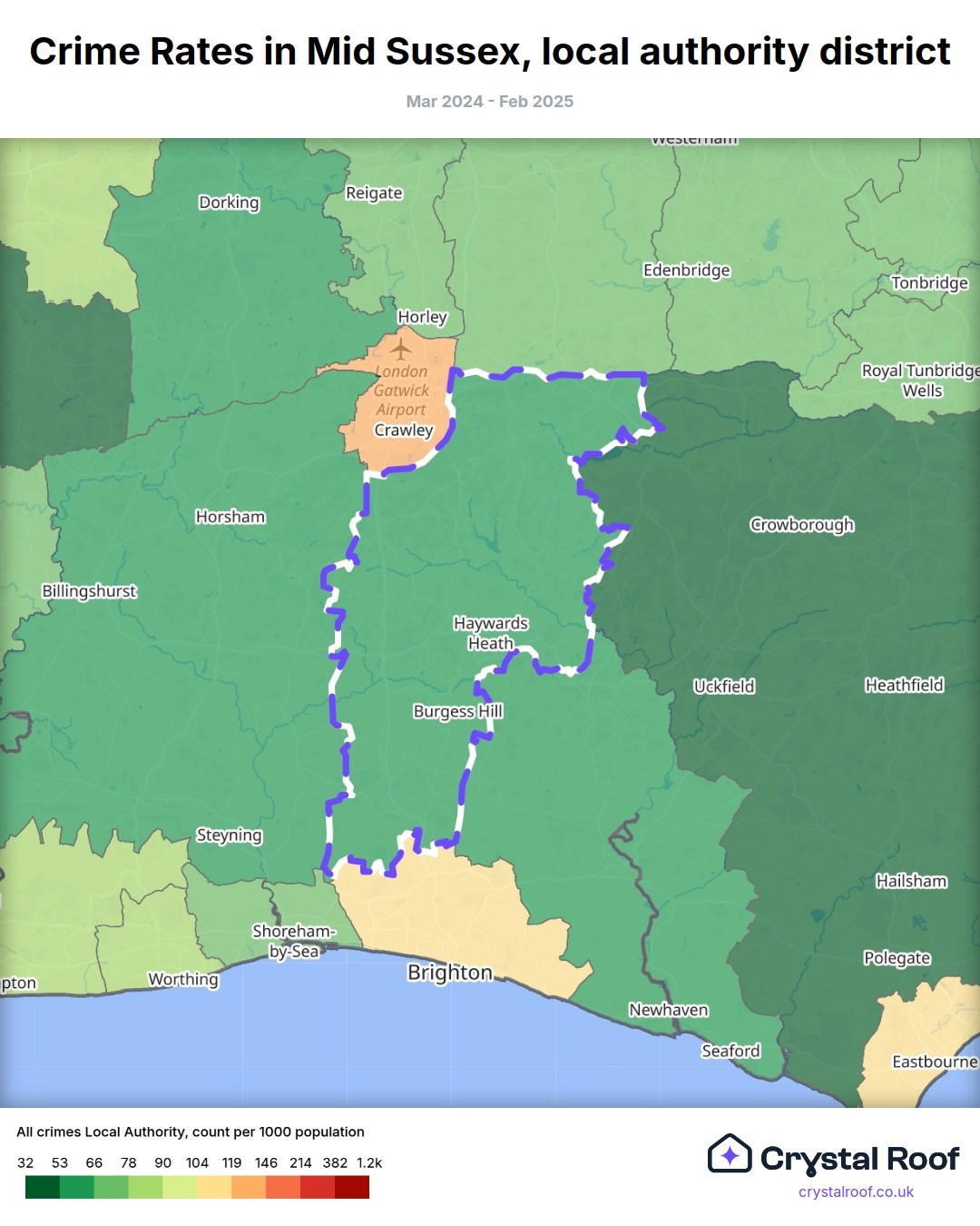 Annual total crime rate in Mid Sussex, (local authority district) is 57 crimes per thousand resident population. This can be rated as 1 out of 10 or low crime level compared to other boroughs/local authority districts in England and Wales.