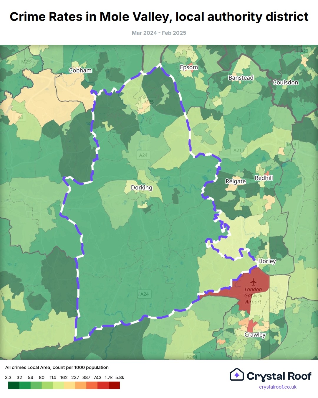 Annual total crime rate in Mole Valley, (local authority district) is 65.8 crimes per thousand resident population. This can be rated as 2 out of 10 or low crime level compared to other boroughs/local authority districts in England and Wales.