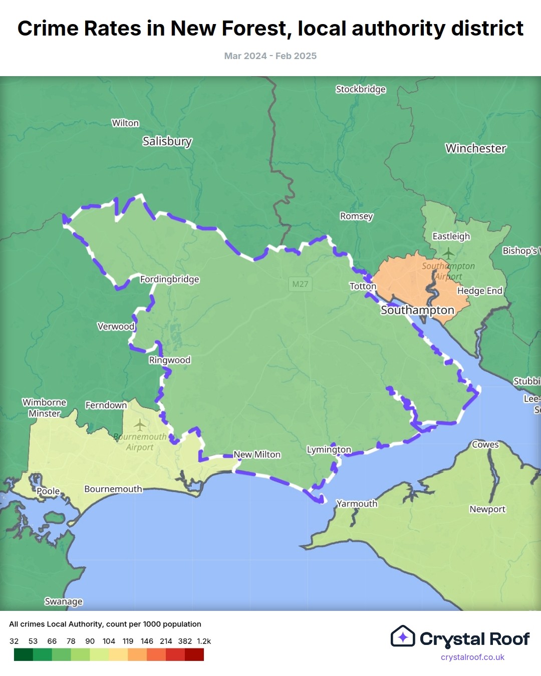 Annual total crime rate in New Forest, (local authority district) is 62.3 crimes per thousand resident population. This can be rated as 2 out of 10 or low crime level compared to other boroughs/local authority districts in England and Wales.