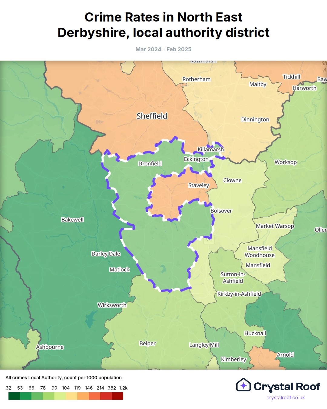 Annual total crime rate in North East Derbyshire, (local authority district) is 68.5 crimes per thousand resident population. This can be rated as 2 out of 10 or low crime level compared to other boroughs/local authority districts in England and Wales.