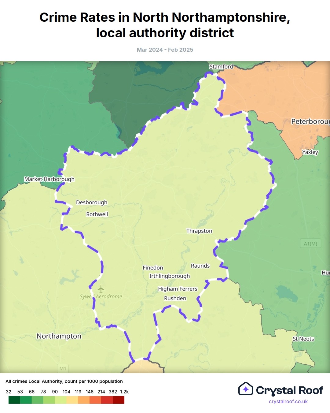 Annual total crime rate in North Northamptonshire, (local authority district) is 95 crimes per thousand resident population. This can be rated as 4 out of 10 or low crime level compared to other boroughs/local authority districts in England and Wales.