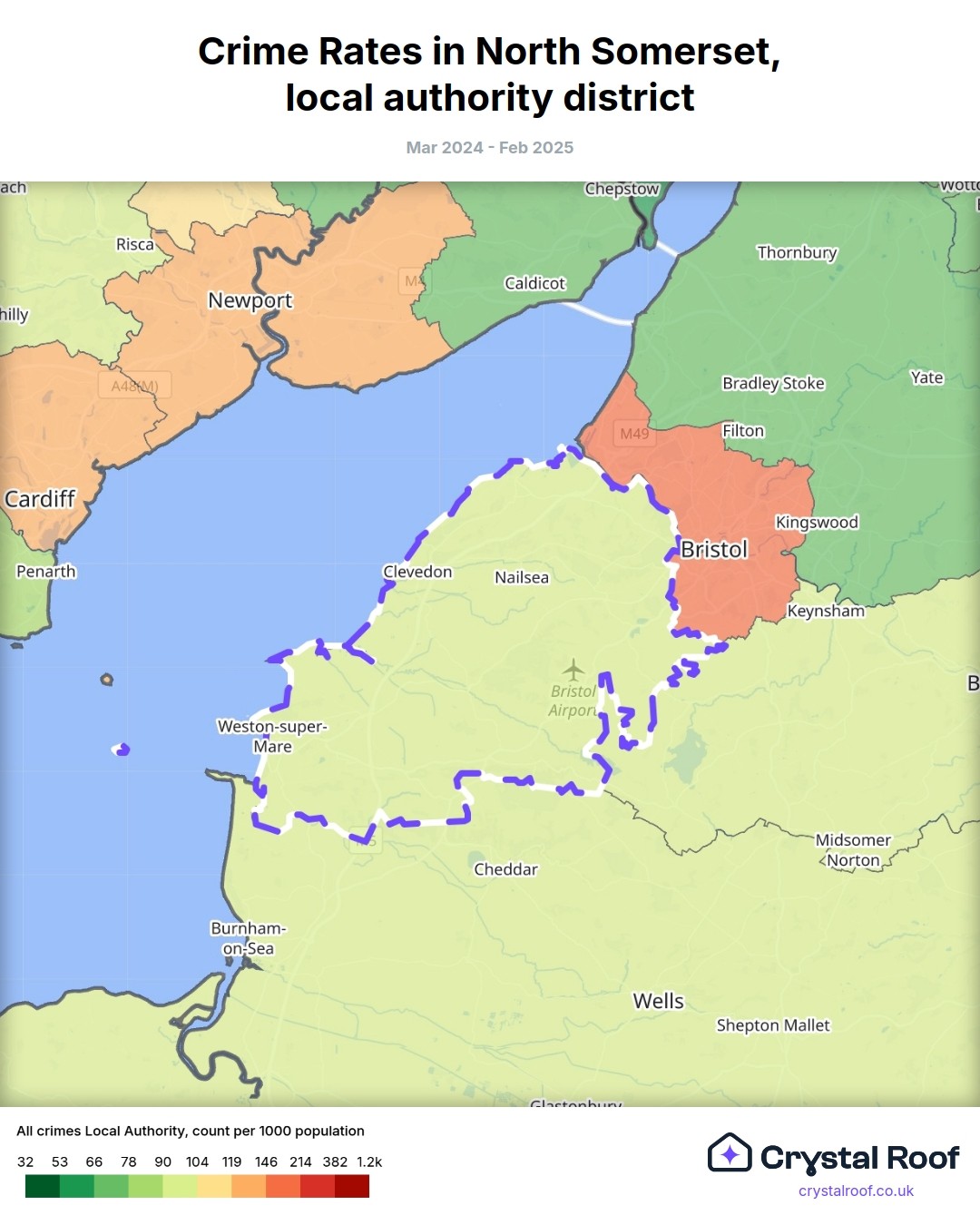 Annual total crime rate in North Somerset, (local authority district) is 87.6 crimes per thousand resident population. This can be rated as 4 out of 10 or low crime level compared to other boroughs/local authority districts in England and Wales.