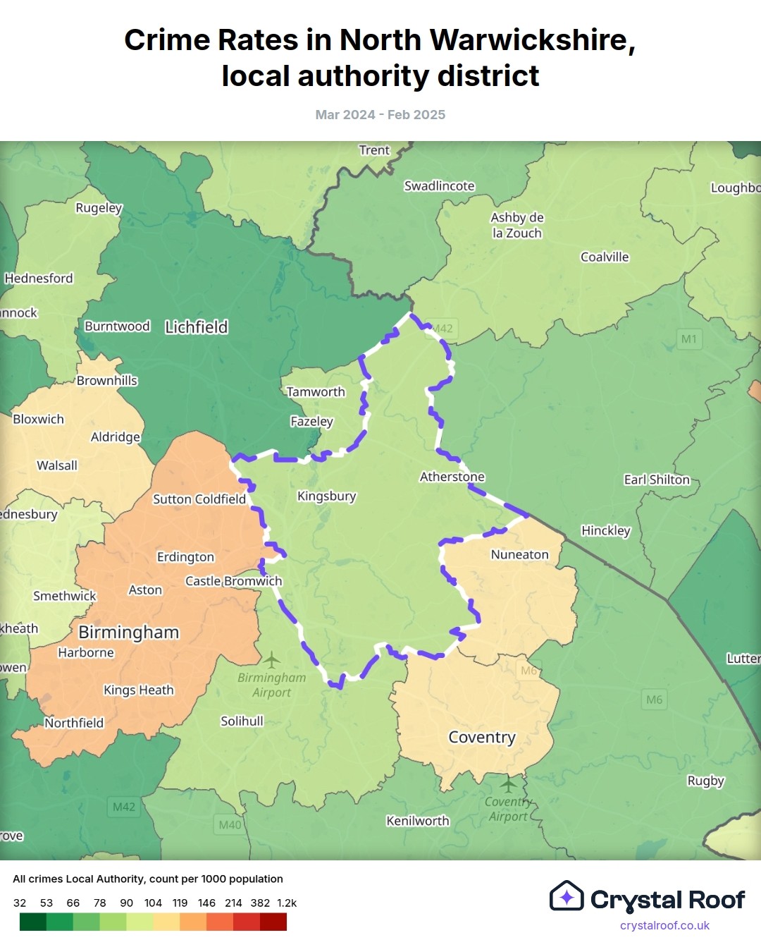 Annual total crime rate in North Warwickshire, (local authority district) is 82.9 crimes per thousand resident population. This can be rated as 3 out of 10 or low crime level compared to other boroughs/local authority districts in England and Wales.