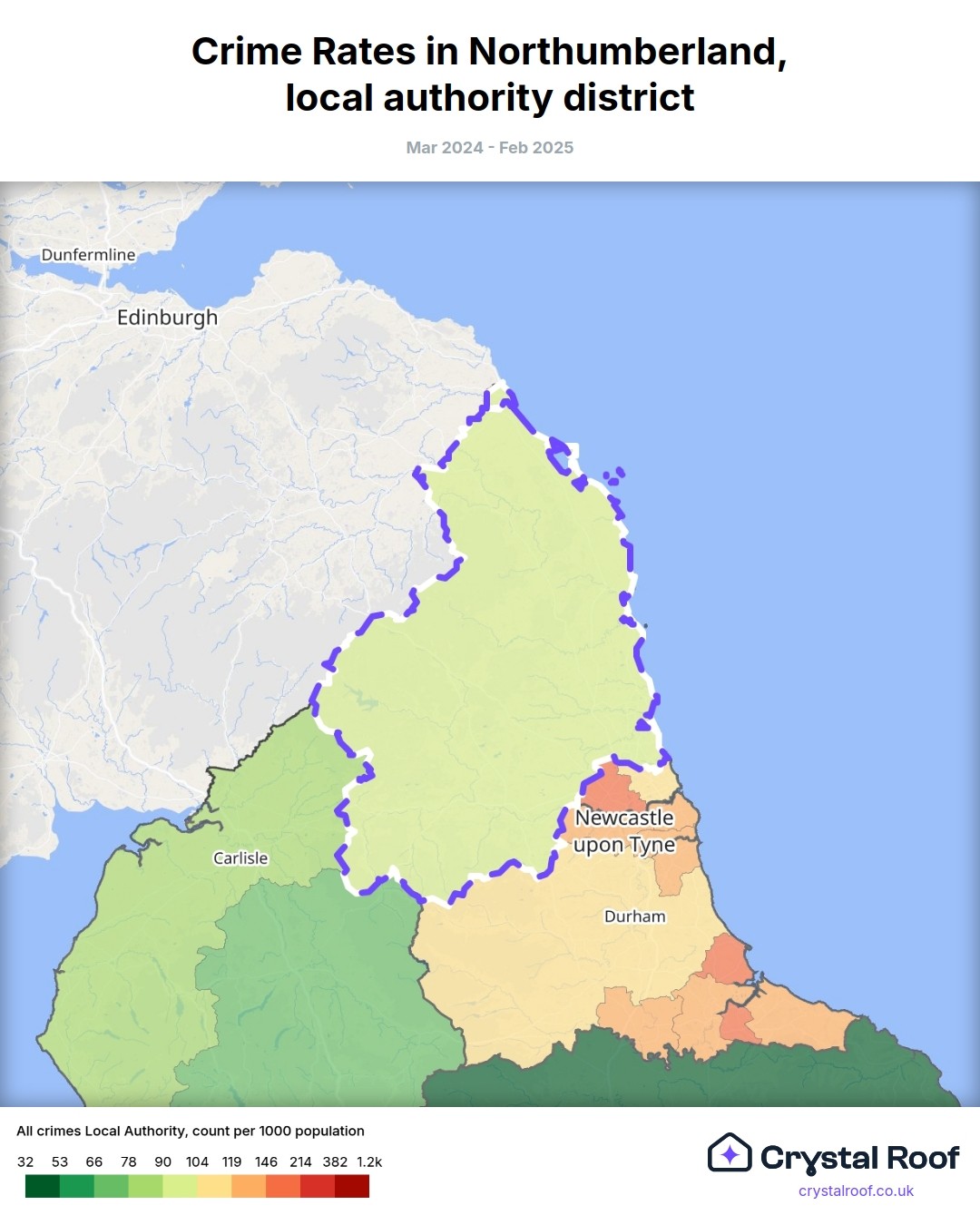 Annual total crime rate in Northumberland, (local authority district) is 94.1 crimes per thousand resident population. This can be rated as 4 out of 10 or low crime level compared to other boroughs/local authority districts in England and Wales.