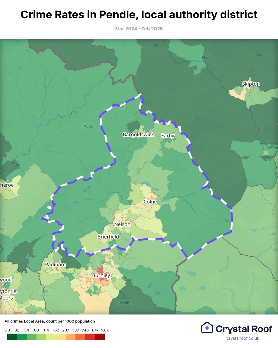 The figures in grey indicate the relative ratings of Pendle (local authority district) for a specific crime type compared to other boroughs/local authority districts in England and Wales.