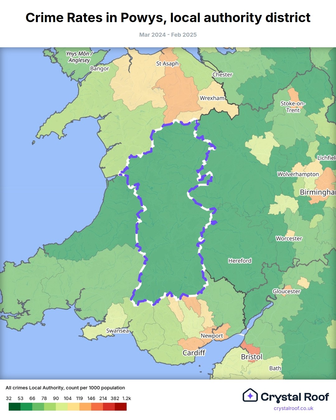Annual total crime rate in Powys, (local authority district) is 66.8 crimes per thousand resident population. This can be rated as 2 out of 10 or low crime level compared to other boroughs/local authority districts in England and Wales.