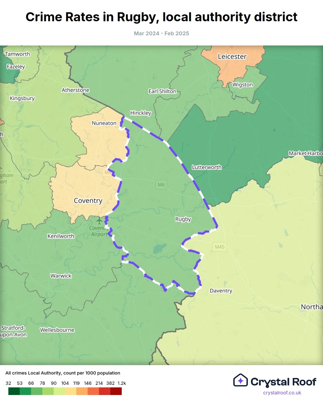 The figures in grey indicate the relative ratings of Rugby (local authority district) for a specific crime type compared to other boroughs/local authority districts in England and Wales.